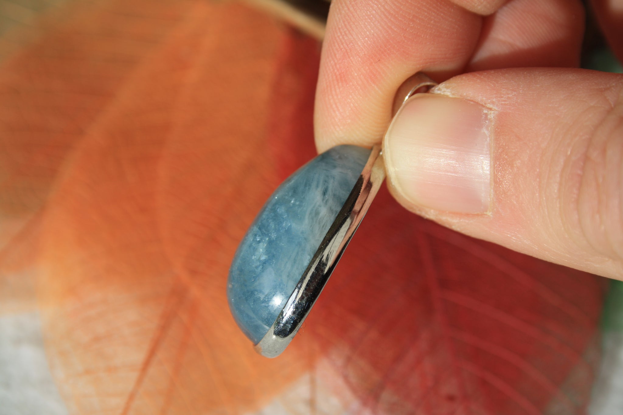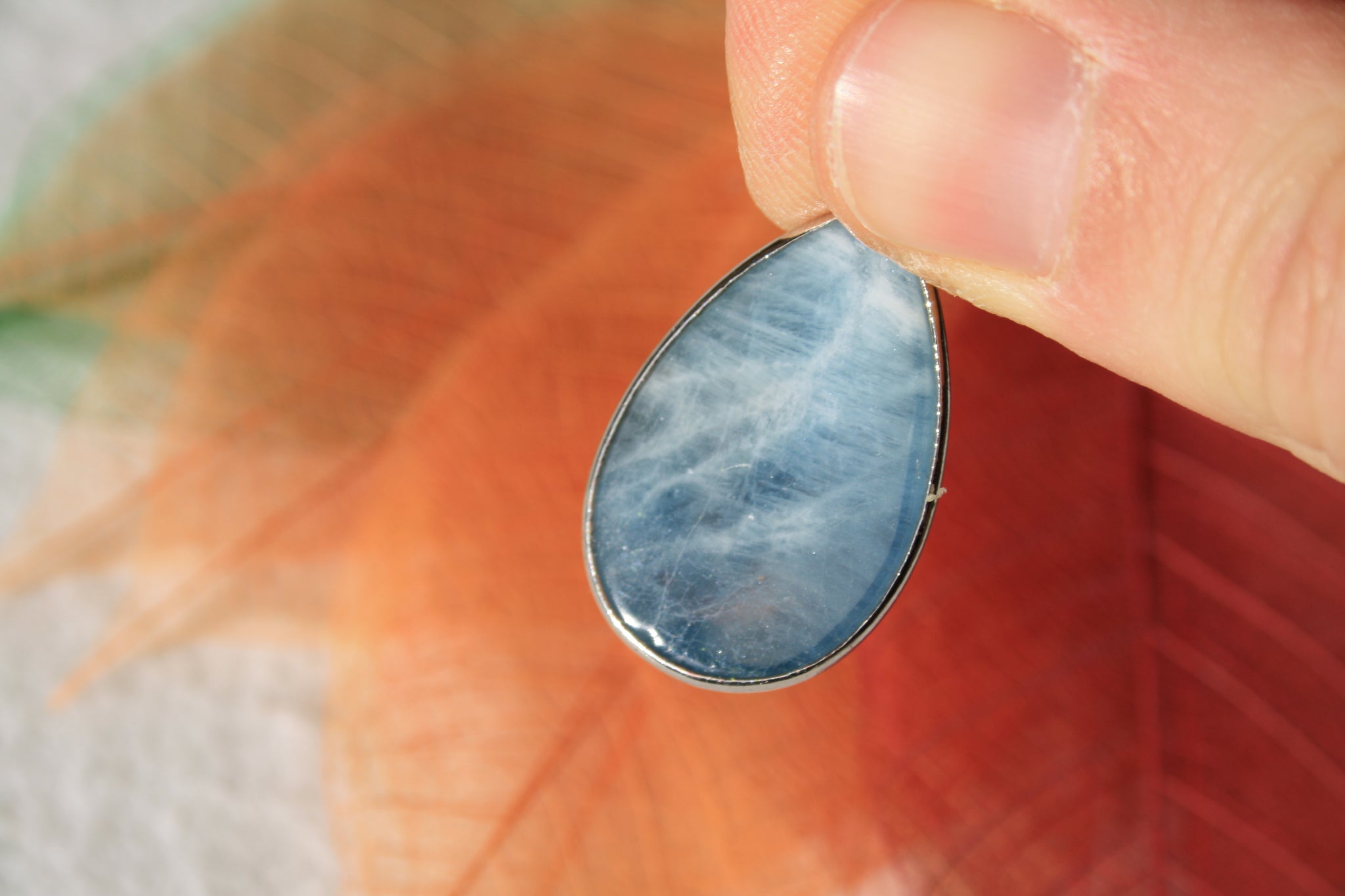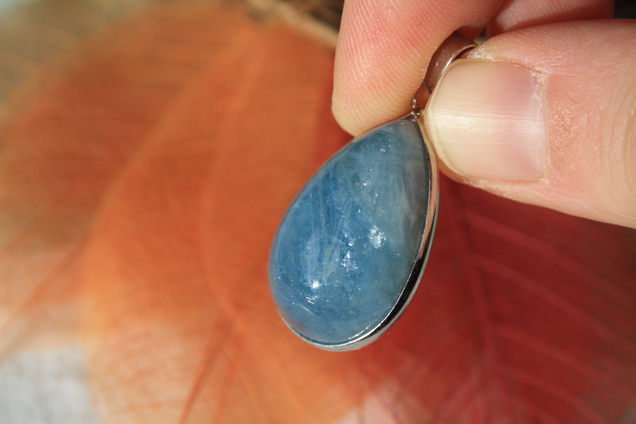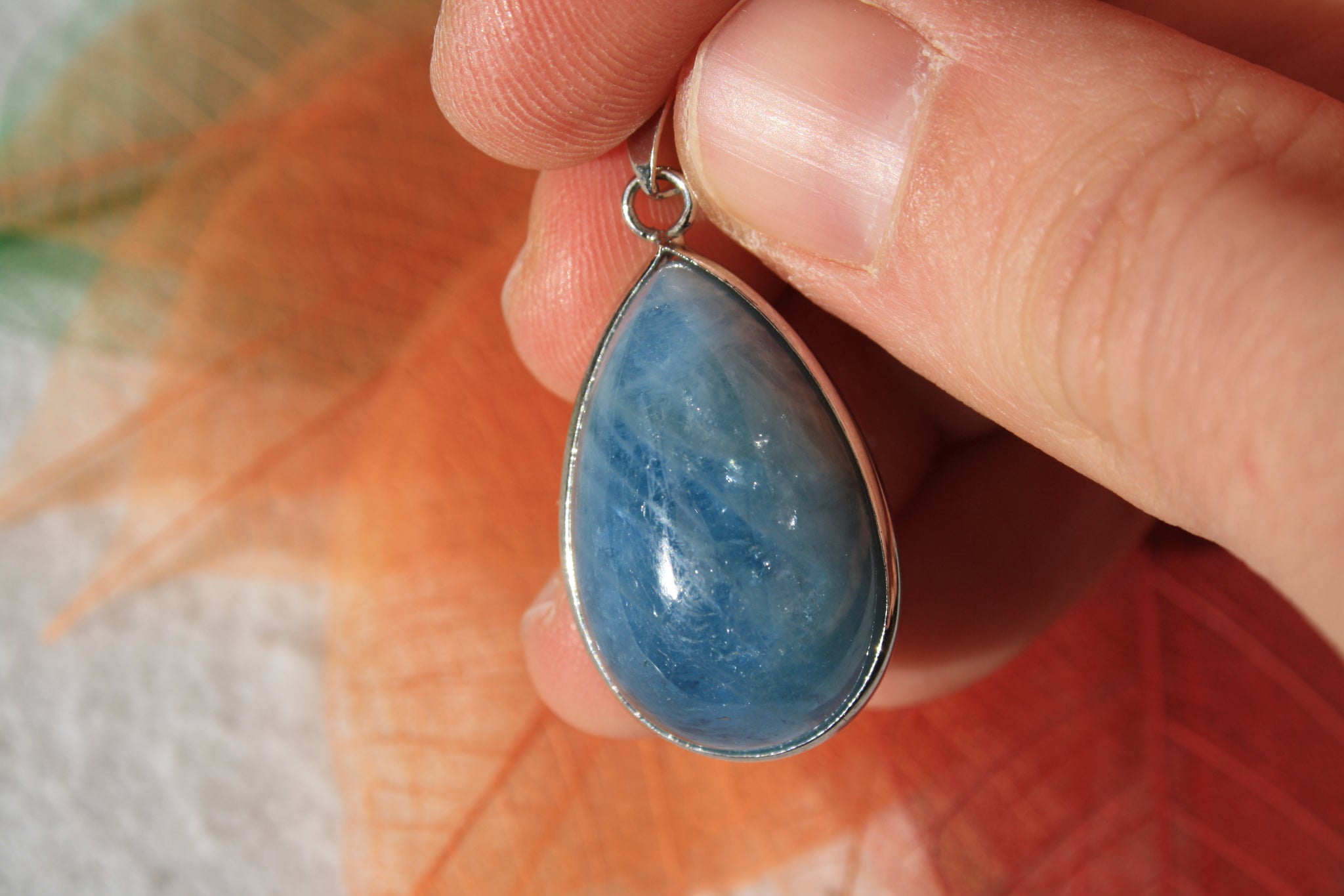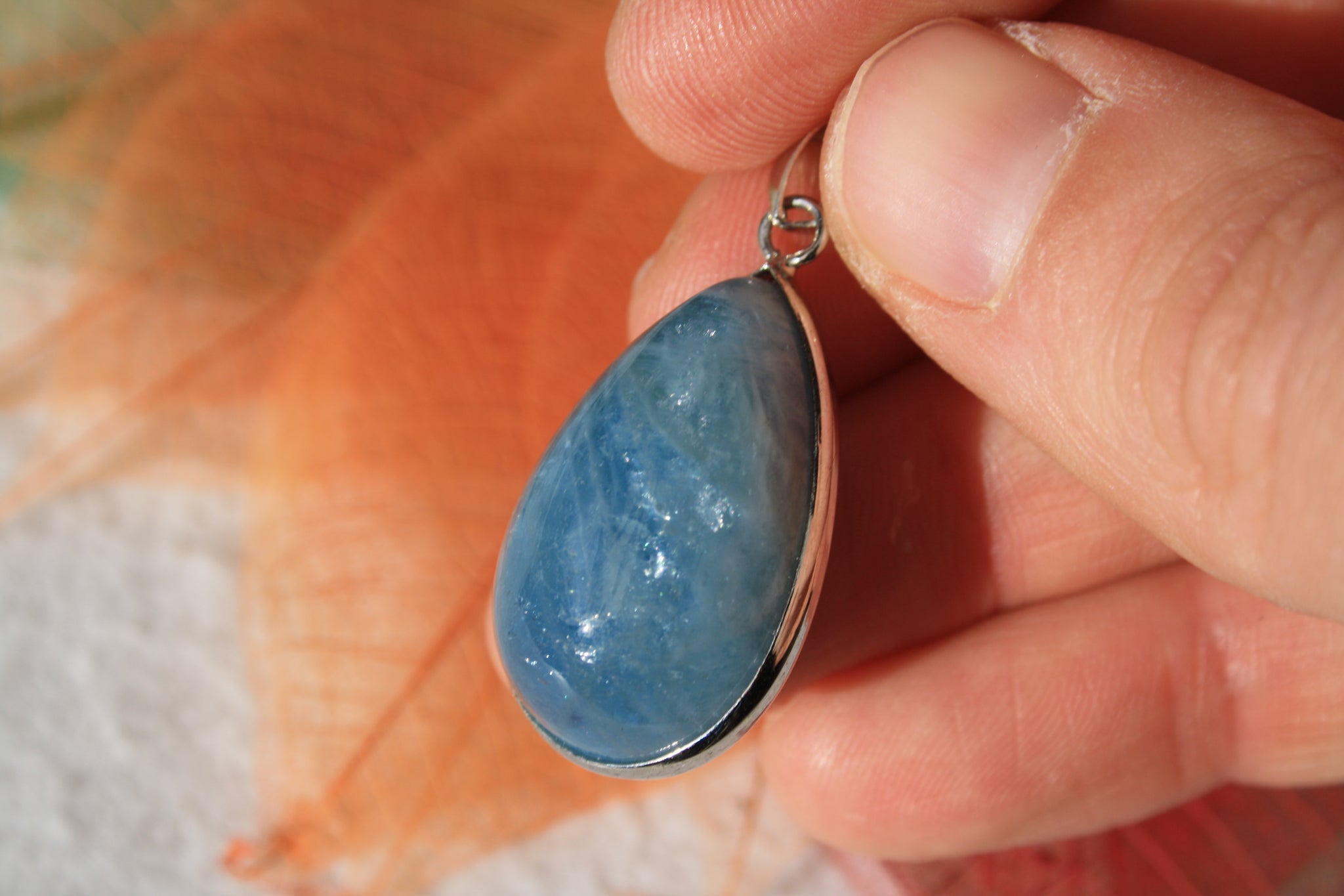 Jolie petite aigue marine de forme de goutte. Sa cristallisation l'enveloppe de lumière, elle est pleine de reflets et de paillettes. La pierre est en contact avec la peau en permanence. Je fournis un tour de cou réglable avec le bijou. Le cerclage est en métal argenté sans nickel.