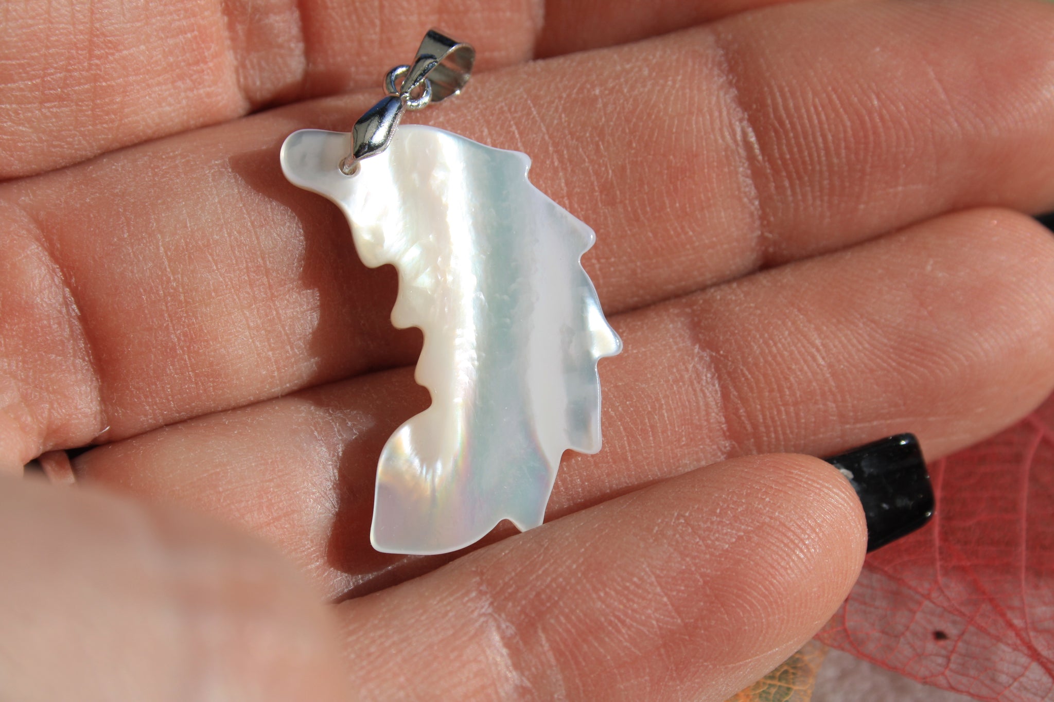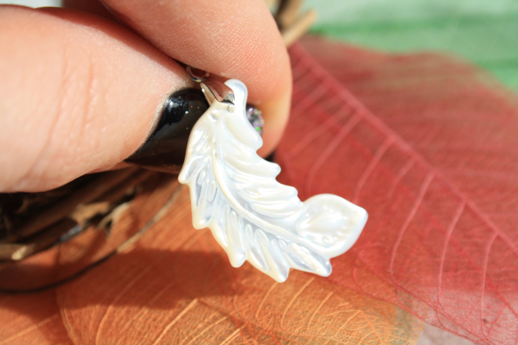 Jolie petite plume en nacre. Elle est très lumineuse et sa taille attire fort le regard. Je vous fournis un tour de cou réglable avec le bijou et sa bélière est en argent.